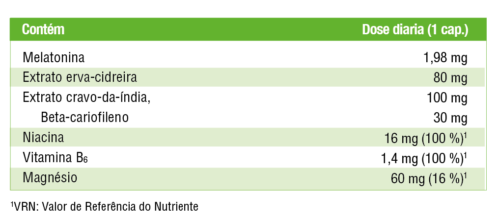 Magnésio (hidróxido de magnésio), agente de volume (celulose microcristalina), agente de revestimento (hidroxipropilmetilcelulose), extrato de cravo-da-índia (Syzygium aromaticum (L.) Merrill et L.M. Perry, flores), extrato de erva-cidreira (Melissa officinalis L., folhas), niacina (nicotinamida), antiaglomerante (sais de magnésio de ácidos gordos), antiaglomerante (dióxido de silício (sílica)), melatonina, vitamina B6 (cloridrato de piridoxina), corante (complexos cúpricos de clorofilinas).