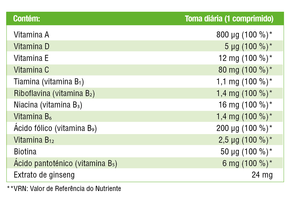 Vitanatur Energia é um suplemento alimentar à base de 12 vitaminas (A, tiamina, riboflavina, niacina, ácido pantoténico, B6, biotina, ácido fólico, B12, C, D, E) e ginseng. Sem açucares. Com edulcorantes.