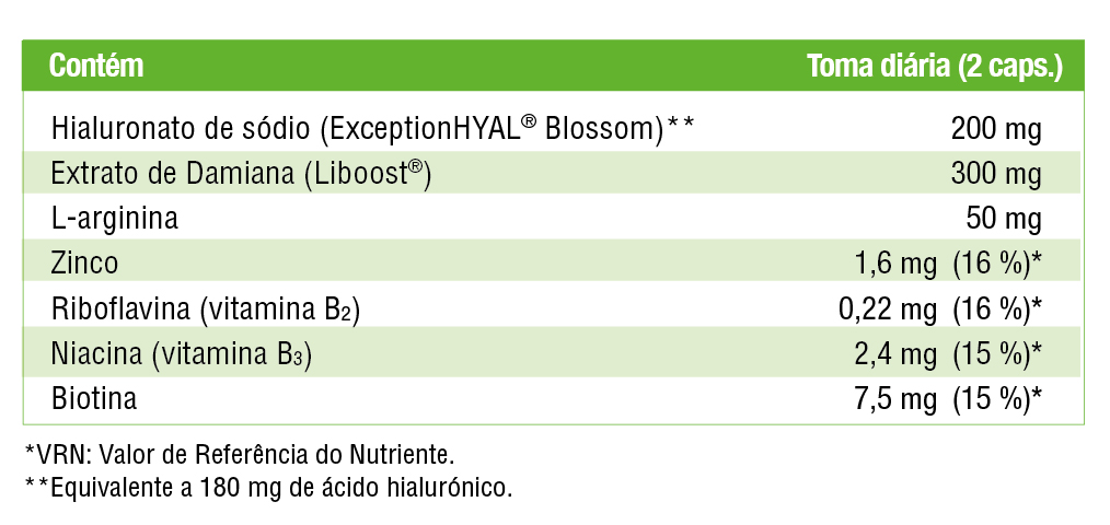 Extrato de folha de damiana (Turnera diffusa Willd. ex Schult.), cápsula vegetal (agente de revestimento [hidroxipropilmetilcelulose], concentrado de sumo de cenoura), hialuronato de sódio, agente de volume (fosfato de cálcio), agente de volume (celulose microcristalina), cloridrato de L-arginina, antiaglomerante (sais de magnésio de ácidos gordos), antiaglomerante (dióxido de silício), zinco (citrato de zinco), niacina (nicotinamida), riboflavina, biotina (D-biotina).