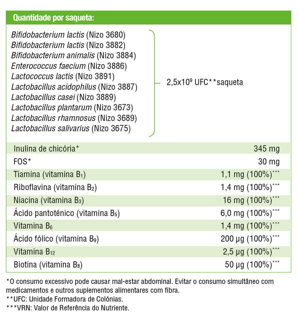 Suplemento alimentar à base de bactérias lácticas liofilizadas, fibras alimentares (FOS e inulina) e vitaminas do grupo B.